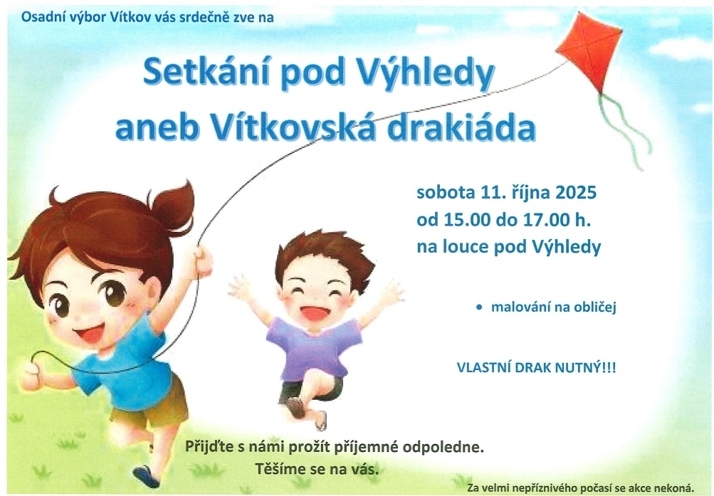 Osadní výbor Vítkov zve na Setkání pod Výhled aneb Vítkovská drakiáda v sobotu 11.10. 2025 od 15:00 do 17:00 h. na louce pod Výhledy.